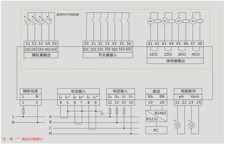 ▲當(dāng)選用電壓量程3×57.7/100V和3×100V時,應(yīng)考慮使用外部PT,為了便于維護,建議使用接線排。