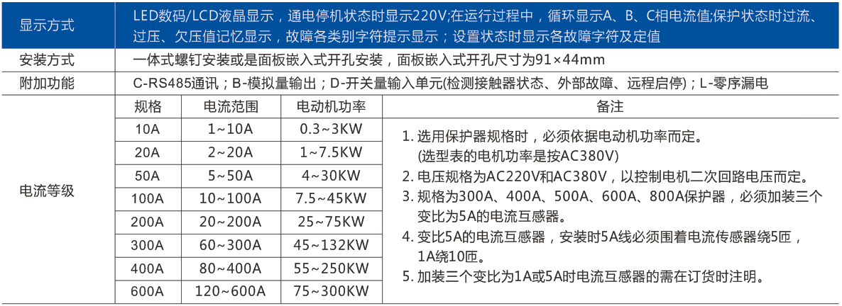 在運行過程中,循環(huán)顯示A、B、C相電流值,每項顯示停留3s當(dāng)電動機(jī)出現(xiàn)過載時,過載指示燈閃爍,且過載電流倍數(shù)越大,過載燈閃爍得越快,直至跳閘。如電流恢復(fù)正常,閃爍自動消失。