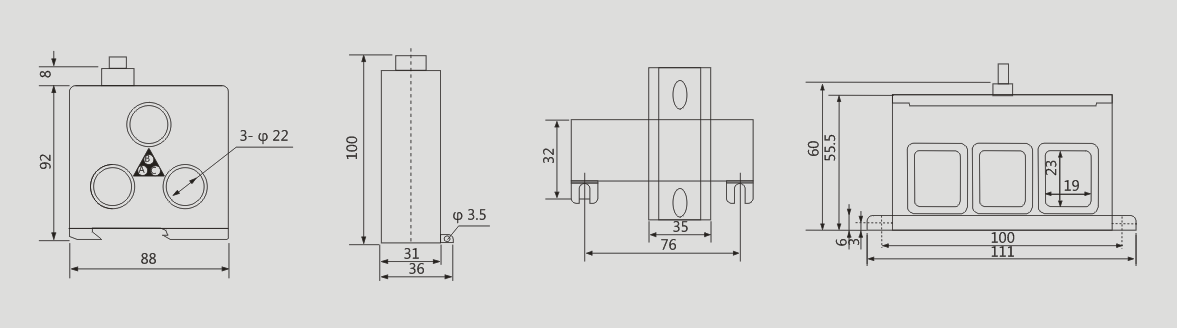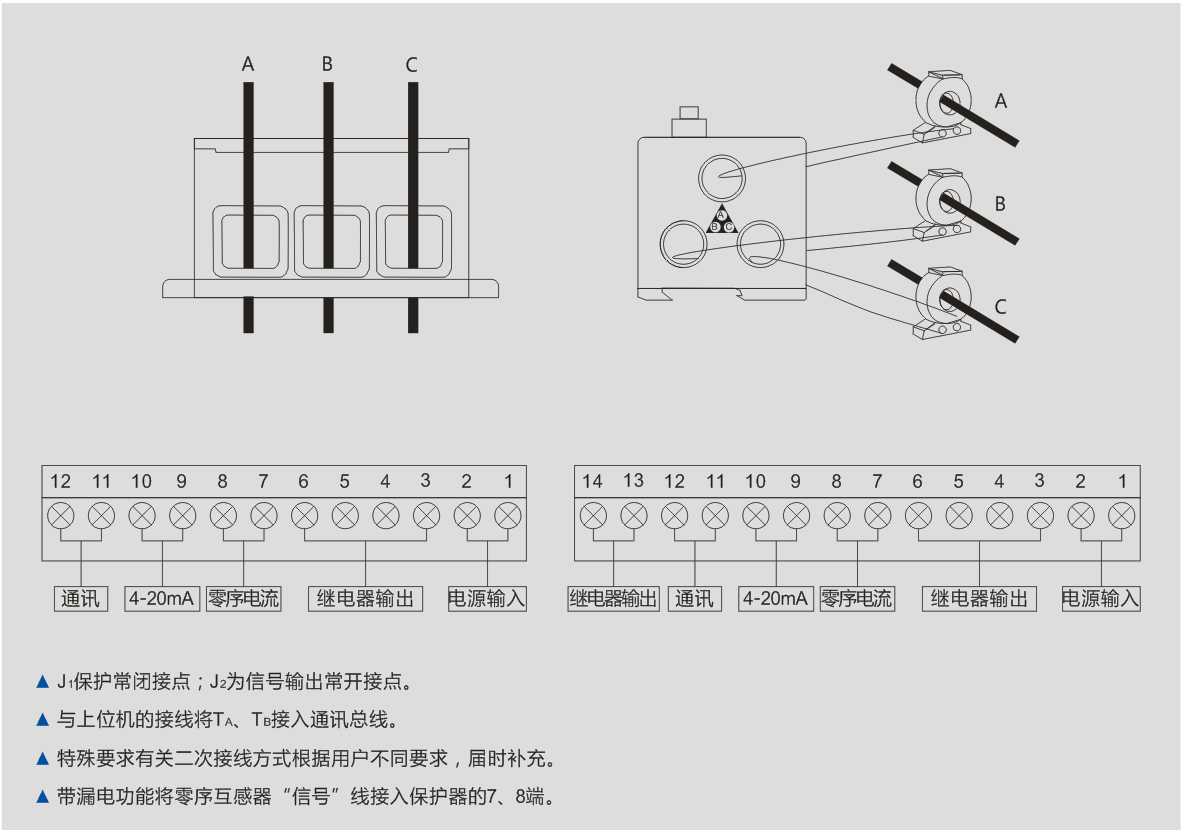 ▲配比功能:在200A及200A以下的保護(hù)器不需要配置互感器,大于200A以上的保護(hù)器需要配置標(biāo)準(zhǔn)0.66型3只變比為5A的電流互感器,二次線再通過我們自帶的互感器。例如400A規(guī)格需要配三只400A/5A的電流互感器。
