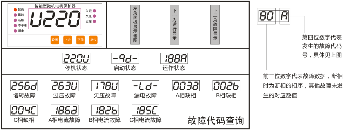 當(dāng)檢測到故障達(dá)到動作時間時,發(fā)出跳閘信號,相應(yīng)故障指示燈點亮,顯示故障代碼。無自啟動功能時,排除故障按復(fù)位鍵可自動或手動啟動電動機(jī);有自啟動功能時,保護(hù)器必須斷電30s后重新上電才可再次啟動。