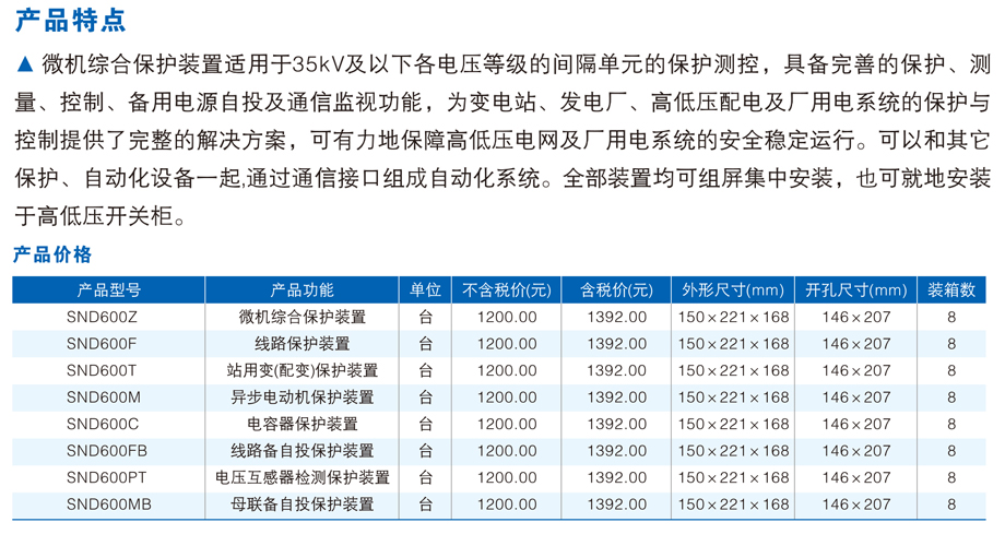 SND660系列數(shù)字式保護測控裝置適用于35kV及以下各電壓等級的間隔單元的保護測控,具備完善的保護、測量、控制、備用電源自投及通信監(jiān)視功能,為變電站、發(fā)電廠、高低壓配電及廠用電系統(tǒng)的保護與控制提供了完整的解決方案,可有力地保障高低壓電網(wǎng)及廠用電系統(tǒng)的安全穩(wěn)定運行??梢院推渌Wo、自動化設(shè)備一起,通過通信接口組成自動化系統(tǒng)。全部裝置均可組屏集中安裝,也可就地安裝于高低壓開關(guān)柜。 具體功能劃分:
