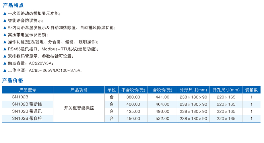 SND102B開關(guān)柜智能操控裝置是一種多功能、智能化模擬動態(tài)指示裝置。用于3-35kv戶內(nèi)開關(guān)柜,適用于中置柜、手車柜、固定柜、環(huán)網(wǎng)柜等多種開關(guān)柜??扇〈F(xiàn)有的一次回路模擬、帶電顯示器、自動加熱除濕控制器,具備了斷路器分合閘狀態(tài)指示、儲能指示、接地開關(guān)指示、手車位置指示、智能防誤語音、溫濕度數(shù)據(jù)測量及數(shù)碼管顯示、RS485通信接口等多項(xiàng)功能。配有柜內(nèi)照明開關(guān)、儲能開關(guān)、遠(yuǎn)程本地轉(zhuǎn)換開關(guān)、斷路器分合閘轉(zhuǎn)換開關(guān)。