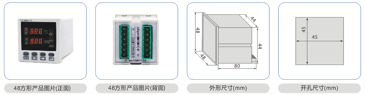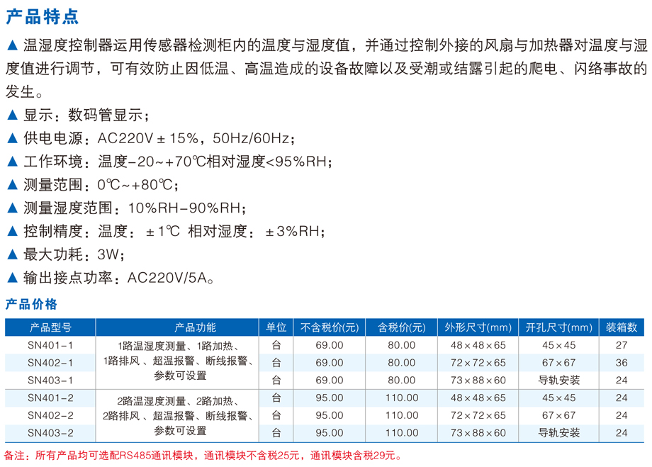 智能型溫濕度控制器采用數(shù)字溫濕度傳感器,以數(shù)碼管方式顯示溫度、溫度值,帶有風扇、加熱器接點,并有加熱器斷線報警、傳感器故障指示等功能。產品還可帶有RS485通訊接口或報警開關量輸出,用于實現(xiàn)環(huán)境溫、濕度值及工作狀態(tài)參數(shù)向上位機遠傳,適合無人值守變電所要求。用戶可通過按鍵編程任意設定溫度、濕度的上下限,循環(huán)顯示方式,通訊參數(shù)等。