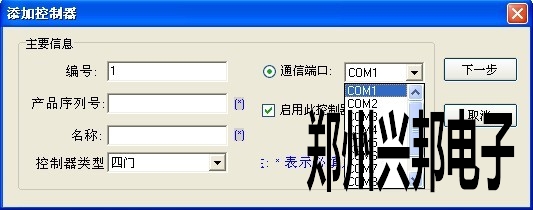 首先選擇好電腦的通訊端口,填寫產(chǎn)品的序列號(hào)一般出廠默認(rèn)設(shè)置是0000,然后為設(shè)備起個(gè)名稱,選擇好所控制門的類型,最后點(diǎn)擊下一步,接著會(huì)彈出如圖七所示對(duì)話框。