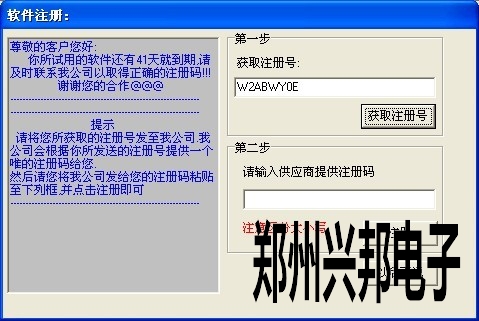 軟件安裝完成后有一個月的試用期,當過了試用期后軟件就打不開了,所以在試用期結(jié)束前就要注冊軟件,軟件注冊時首先在軟件的幫助-軟件注冊中獲取一個注冊號,如下圖所示,把獲取到的注冊號發(fā)到公司,公司會提供一個注冊碼,把注冊碼復雜粘貼到第二步的注冊碼中,點擊注冊就可以了。如果軟件已經(jīng)過期獲取不到注冊號,那么就要通過一個小插件獲取注冊號,在插件上進行注冊就可以了。