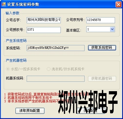 4) 系統(tǒng)密碼:跟卡的加密有關(guān),單擊【設(shè)置密碼】出現(xiàn)圖輸入卡的加密參數(shù)(根據(jù)公司所提供的信息填寫(xiě)),單擊【獲取系統(tǒng)密碼】,單擊【保存配置】。將獲取的密碼粘貼到系統(tǒng)密碼后面的空白處。再次打開(kāi)該窗口時(shí)可以單擊【讀取原始密碼】,獲得卡的加密信息。