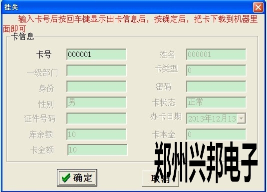 1. 打開485售飯機(jī)軟件--卡掛失,輸入卡號(hào)后按回車,當(dāng)出現(xiàn)卡信息時(shí)點(diǎn)確定鍵即可掛失此卡。