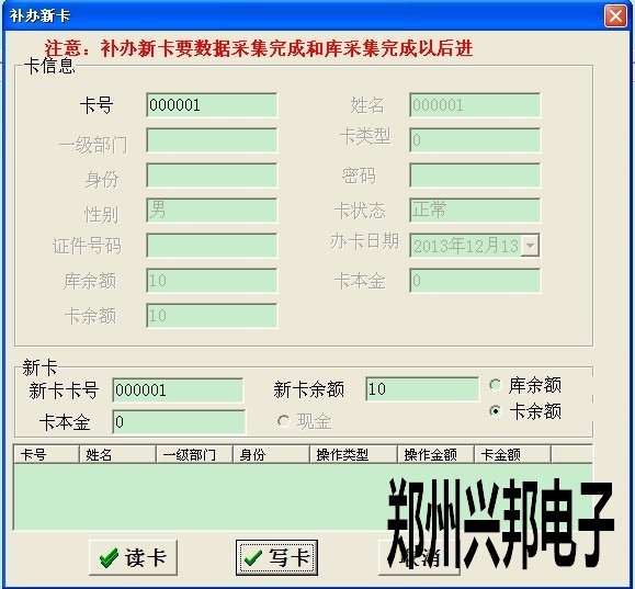 2. 此卡掛失后,然后點(diǎn)卡管理--補(bǔ)辦新卡,打開此對(duì)話框后輸入卡號(hào)后按回車鍵,當(dāng)出現(xiàn)卡信息時(shí),把新卡放到讀卡器上點(diǎn)讀卡,然后點(diǎn)寫卡即可,如下圖所示