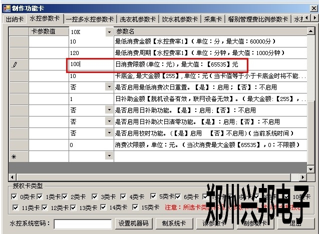 2)打開軟件 制卡中心-功能卡制作-水控參數(shù)卡中的日限額,輸入要設(shè)置的值,以元為單位,如下圖所示,代表100元,最大可設(shè)置到65535元,設(shè)置好后點擊制參數(shù)卡即可;