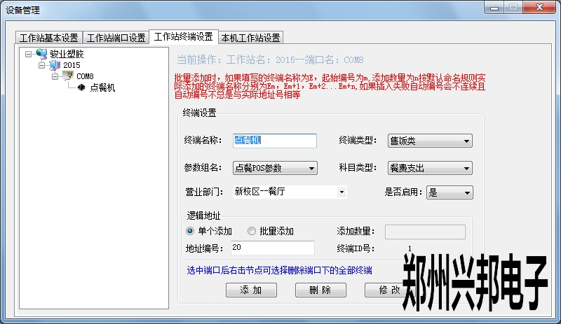 工作站終端設(shè)置:在端口地址下添加終端,進(jìn)行添加時(shí)填寫終端名稱,選擇終端類型、參數(shù)組名、科目類型、營業(yè)部門,是否啟用選擇是,添加地址時(shí)可以選擇單個(gè)添加和批量添加。此地址編號(hào)要與機(jī)器的編號(hào)相同。進(jìn)行批量添加時(shí)填寫添加數(shù)量、地址號(hào),點(diǎn)擊添加后就可以以地址號(hào)遞增的形式添加機(jī)器。選中終端可以進(jìn)行修改和刪除操作,選擇端口右擊可以刪除端口下的所有終端。