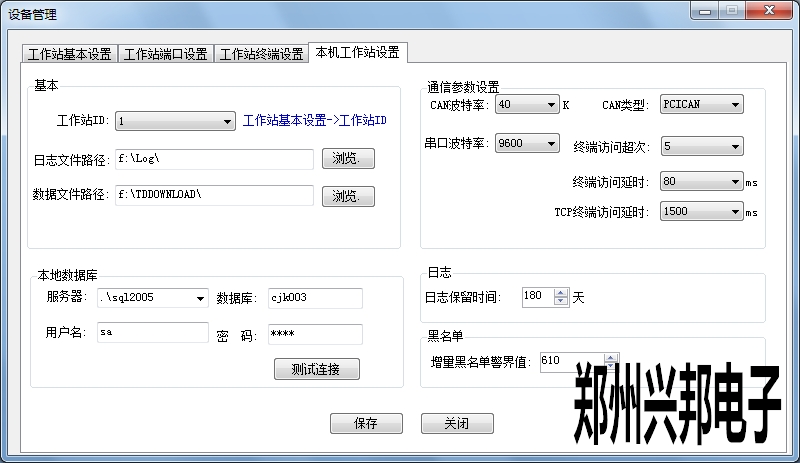 本機(jī)工作站設(shè)置:工作站ID即選擇工作站基本設(shè)置中添加工作站的ID號(hào),下面選擇存放日志文件和數(shù)據(jù)文件的地址;通訊參數(shù)設(shè)置中CAN波特率默認(rèn)為40K,串口波特率默認(rèn)為9600,此處設(shè)置不對(duì)會(huì)導(dǎo)致機(jī)器不通訊。終端訪問超次從1到100,默認(rèn)為5,終端訪問延時(shí)從10ms到6000ms,默認(rèn)為20ms,此處設(shè)置會(huì)影響監(jiān)控平臺(tái)下載參數(shù)和上傳記錄的速度,一般使用默認(rèn)值;本地?cái)?shù)據(jù)庫設(shè)置中服務(wù)器選擇數(shù)據(jù)庫2005的服務(wù)器名,數(shù)據(jù)庫填寫創(chuàng)建采集庫的數(shù)據(jù)庫名稱,用戶名sa,密碼為hnzz,設(shè)置后點(diǎn)擊測(cè)試連接,看能否連通;日志保留時(shí)間和增量黑名單警界值可以自主更改。