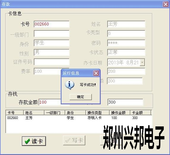 正常的情況是將卡放在讀卡器上,點擊【讀卡】出現(xiàn)卡信息,在存款金額右邊的文本框中輸入存款金額,然后點擊【寫卡】,提示寫卡成功后點擊【確定】按鈕即可。存錢后最大卡金額不能超過9999.99
