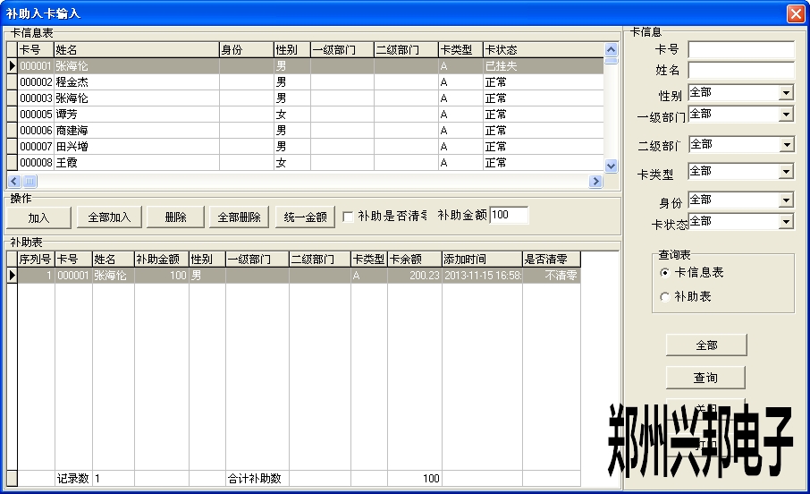 軟件中卡管理-補(bǔ)助入卡-補(bǔ)助入卡輸入中添加補(bǔ)助人員的名單,可以選擇是否清零,若選擇補(bǔ)助清零,在領(lǐng)取補(bǔ)助時(shí)會將卡上的金額先清零再補(bǔ)助上此次的金額;若選擇不清零,則在領(lǐng)取補(bǔ)助時(shí)會累加之前卡上的金額。