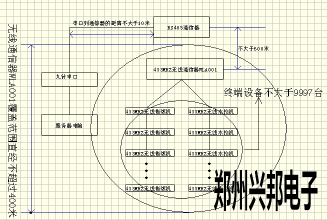 433MHZ無(wú)線通信器(WLA001)使用框圖如下所示,一個(gè)433MHZ無(wú)線通信器(WLA001)的無(wú)線覆蓋范圍為直經(jīng)400米(空曠地區(qū));只要在收發(fā)的范圍內(nèi),可連接的終端設(shè)備的臺(tái)數(shù)理論上沒(méi)有限制;地址號(hào)9998、9999,終端設(shè)備不可用,系統(tǒng)使用;