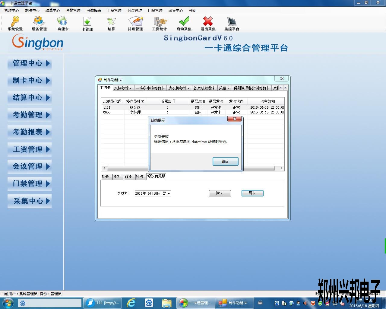 有客戶反應(yīng),在使用食堂消費機軟件時登錄出納卡的時候提示己過有效期,進入軟件修改有效期的時間出現(xiàn)了報錯,出現(xiàn)了更新失敗,從字符串向datetime轉(zhuǎn)換失敗。這是什么情況造成的呢?