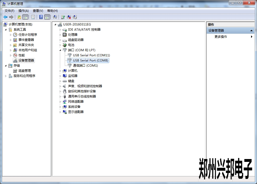 單擊計(jì)算機(jī)—單擊右鍵—管理—設(shè)備管理—端口。找到所用usb線端口。如下圖: