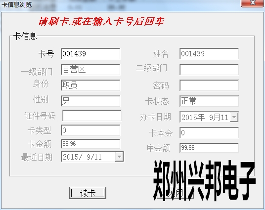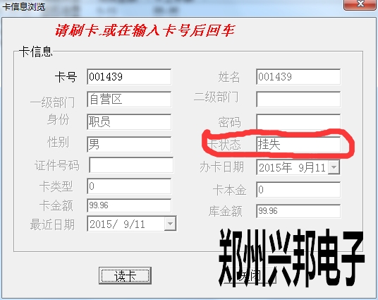 卡片就上面三種狀態(tài),另外一些操作,會造成卡狀態(tài)改變,比如:掛失的卡解掛,就變成消費卡;掛失的卡補辦新卡,掛失卡就會變成新卡;消費卡被收繳舊卡就變成新卡。新卡在消費機上刷卡會顯示1-Err,消費卡會顯示金額,掛失卡會顯示4-Err。