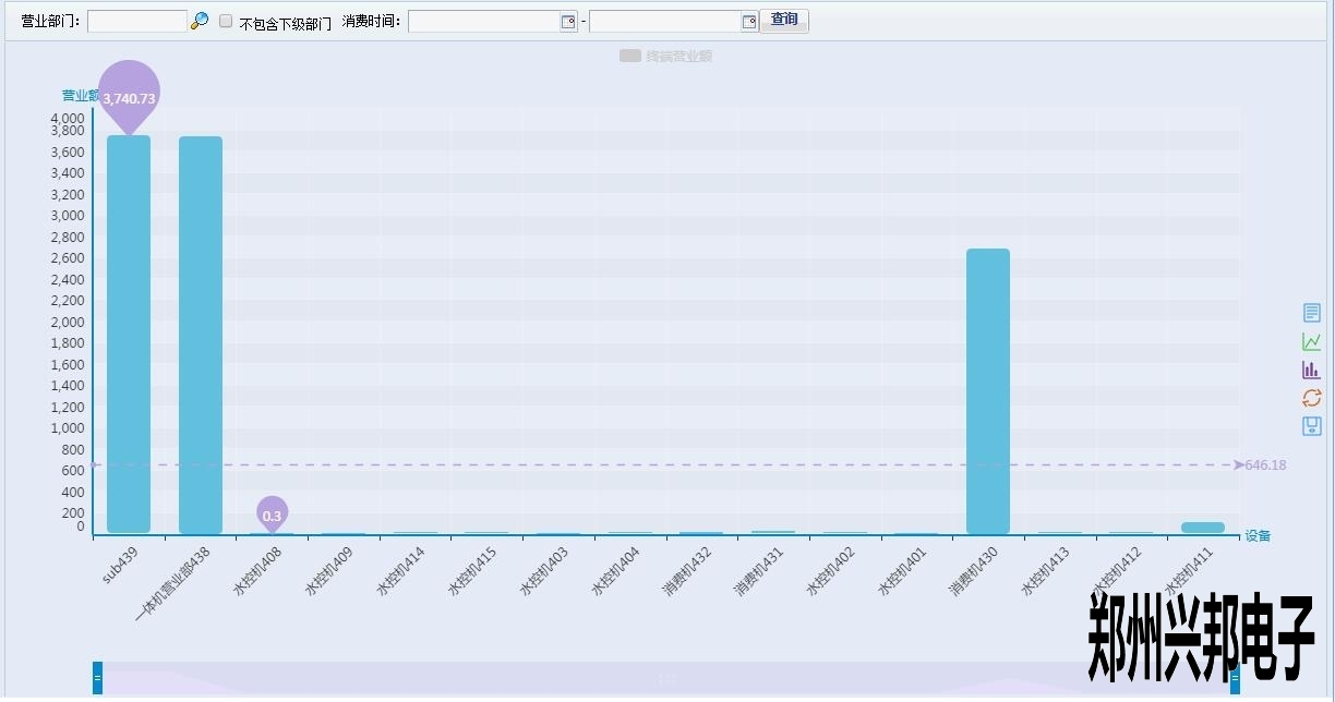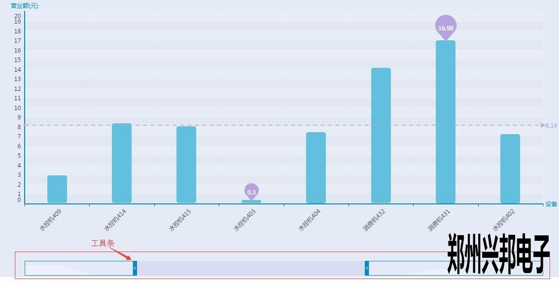 這是一個(gè)柱狀的數(shù)據(jù)圖表,展示了各個(gè)終端在所查詢時(shí)間內(nèi)的營業(yè)情況,那么最下面的那條橫杠是什么呢?其實(shí)那是一個(gè)工具條,用來集中顯示某個(gè)具體的柱狀數(shù)據(jù),如水控機(jī)409以及后面的幾個(gè)數(shù)據(jù)都看不大清楚,想要拉近一點(diǎn)看看,怎么做呢,很簡單,只要拉動最下面的工具條就好了,就像這樣: